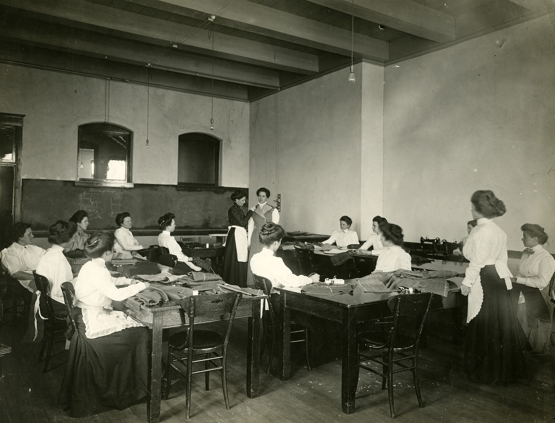 Students participate in a 1912 sewing class, held in present-day Calvin Hall.