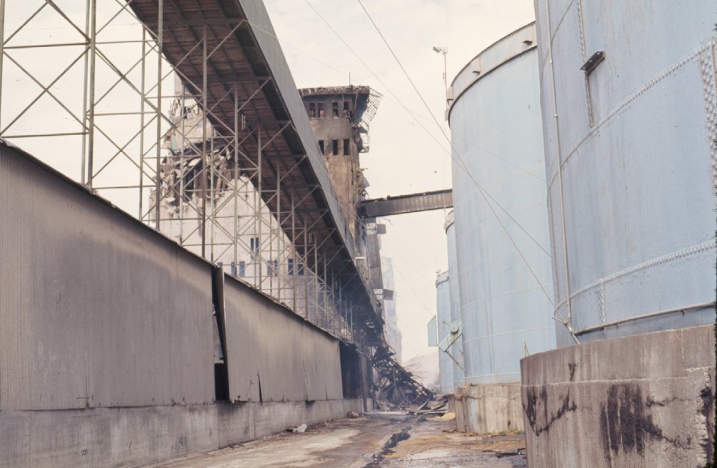Damage to shipping conveyor, headhouse, storage tanks.