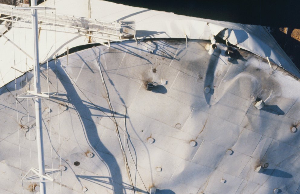 Overhead view of damaged roof of tank.