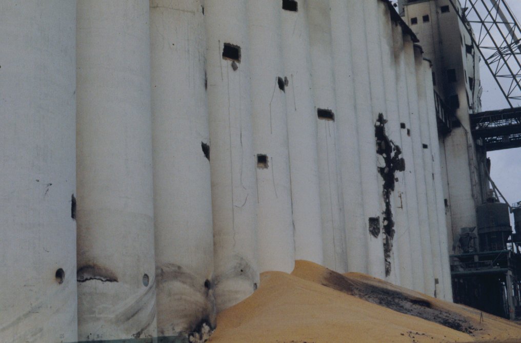 Spilled grain from ruptured silos.