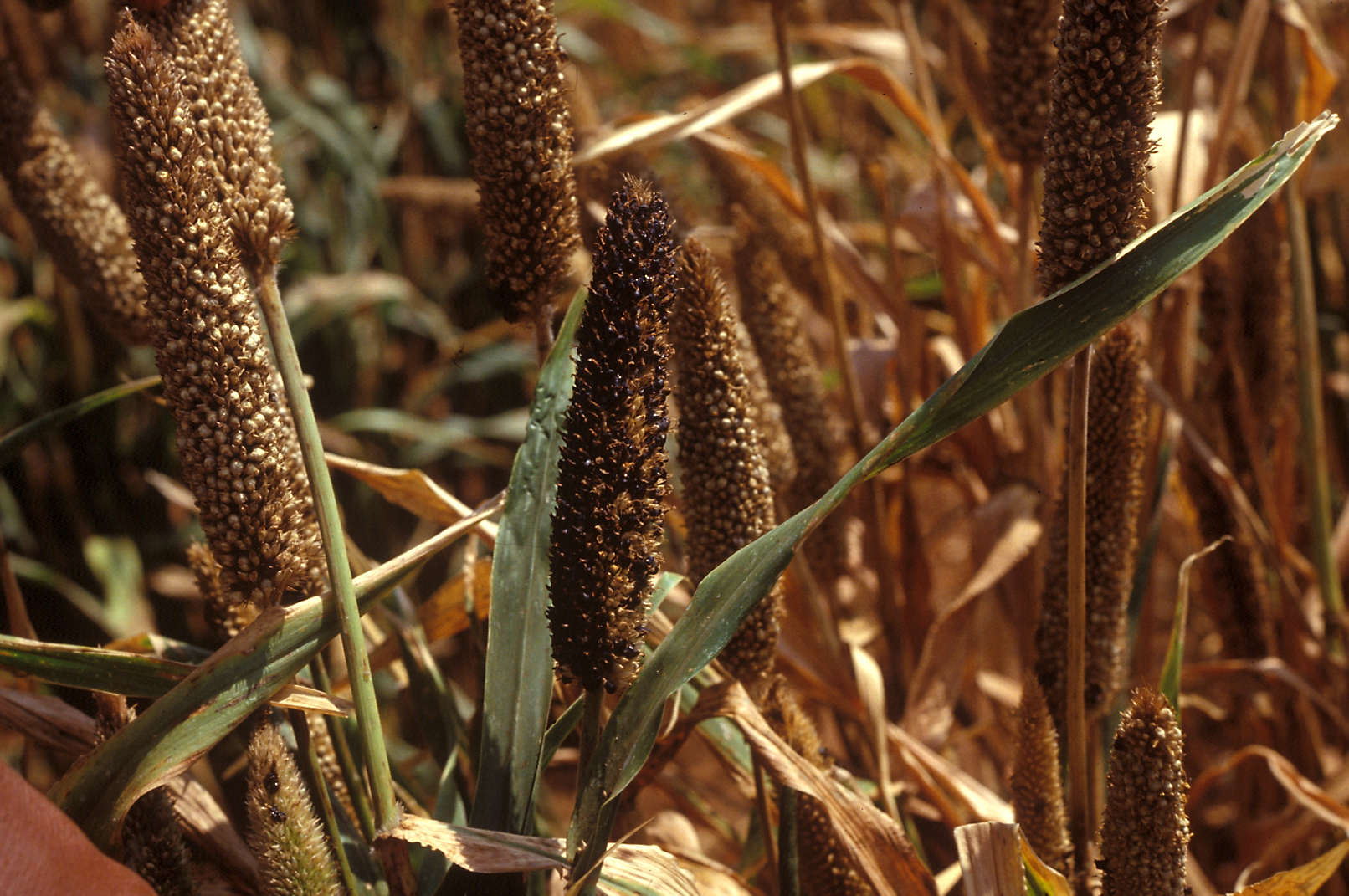 Bambey, Senegal: Several panicles exhibiting symptoms under field conditions.