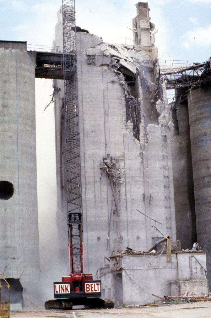 Demolition; top of headhouse off huge cloud of dust on west side.