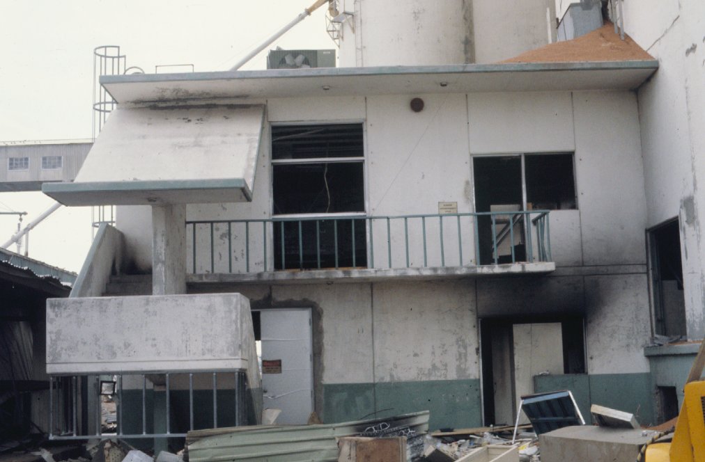 Building containing elevator control room and superintendents office. Two men in control room were killed; superintendent survived.