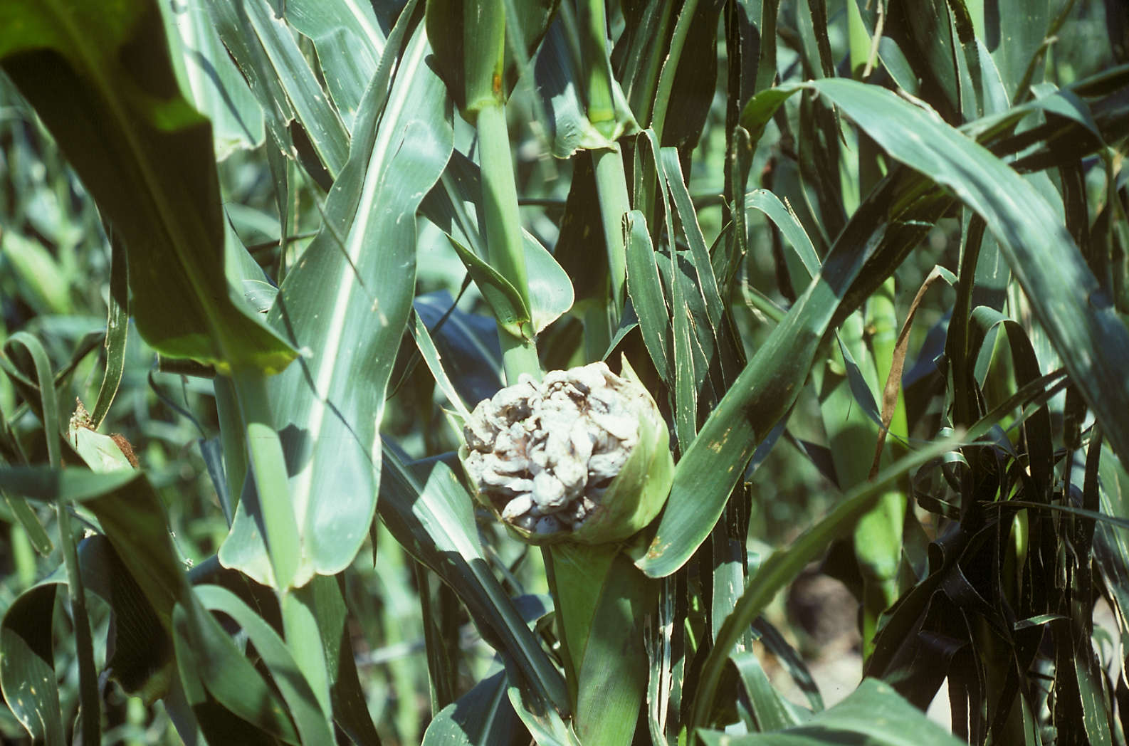 Common smut occurs wherever corn is grown. A young gall on an ear is covered with a glistening white tissue. When mature, galls become a mass of black teliospores.
