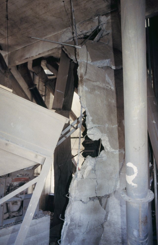 Powerful explosion pushed bottom of bin full of corn out through sidewall.