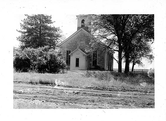 Old church across from a dirt road in Wabaunsee, KS, May 30, 1932
