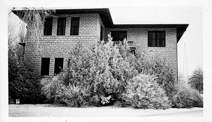 Snow covered trees and bushes on the east end of Thompson Hall