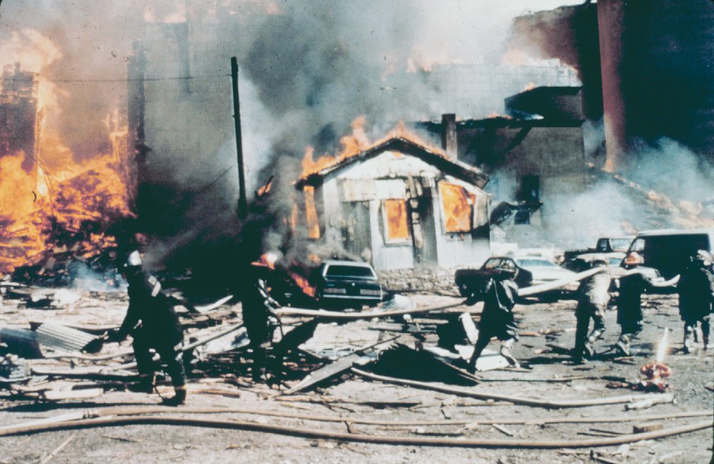Fireman on the scene; office building totally involved - elevator was a total loss.