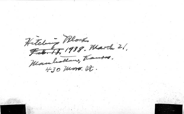 Hitching block at 430 Moro St, Manhattan, KS, March 21, 1938