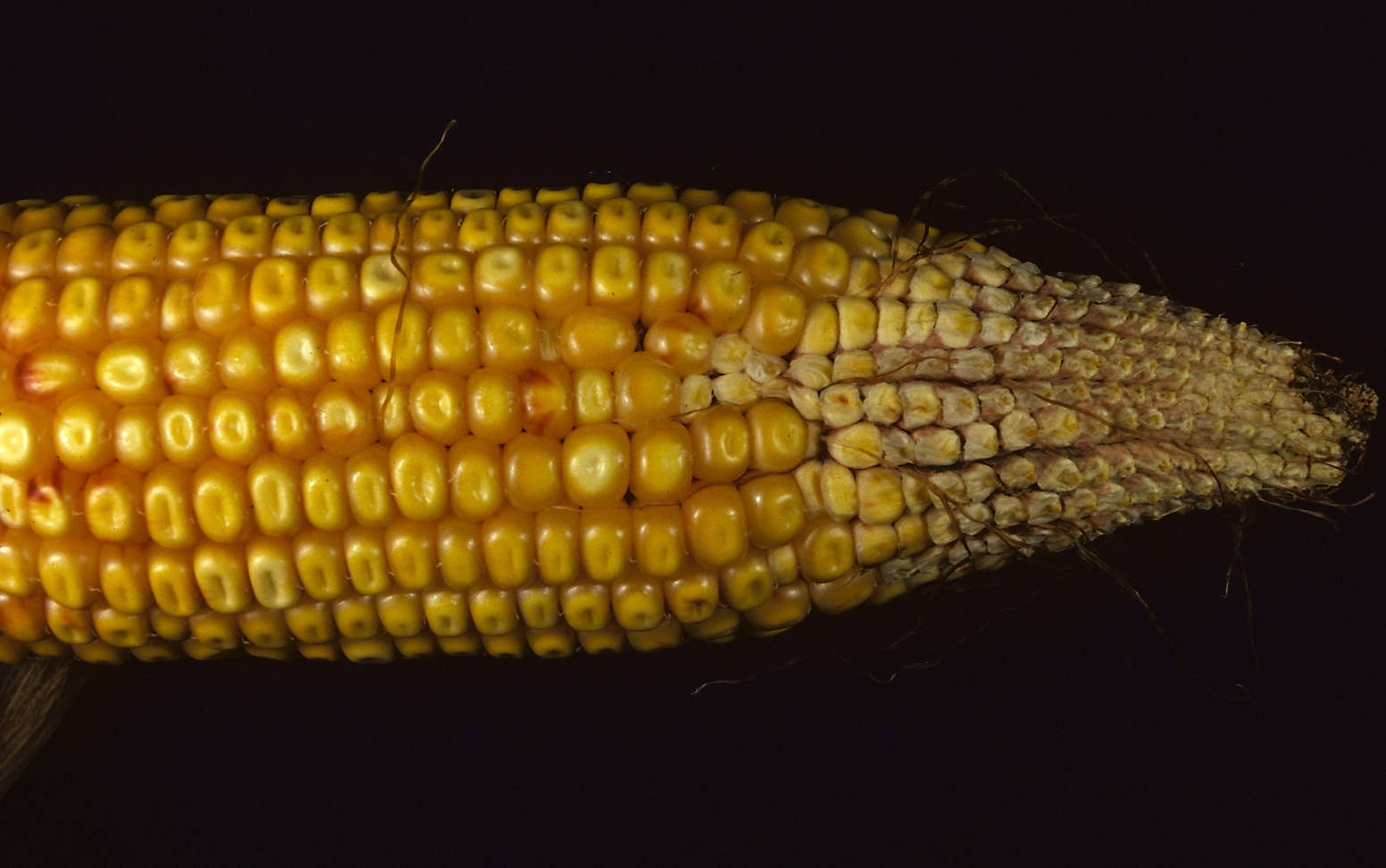 Wheat streak is vectored by the wheat curl mite, Eriophytes tulipae. After wheat matures, mites will be disseminated via wind to corn and other hosts. The reddish kernels are indicative of mite damage.
