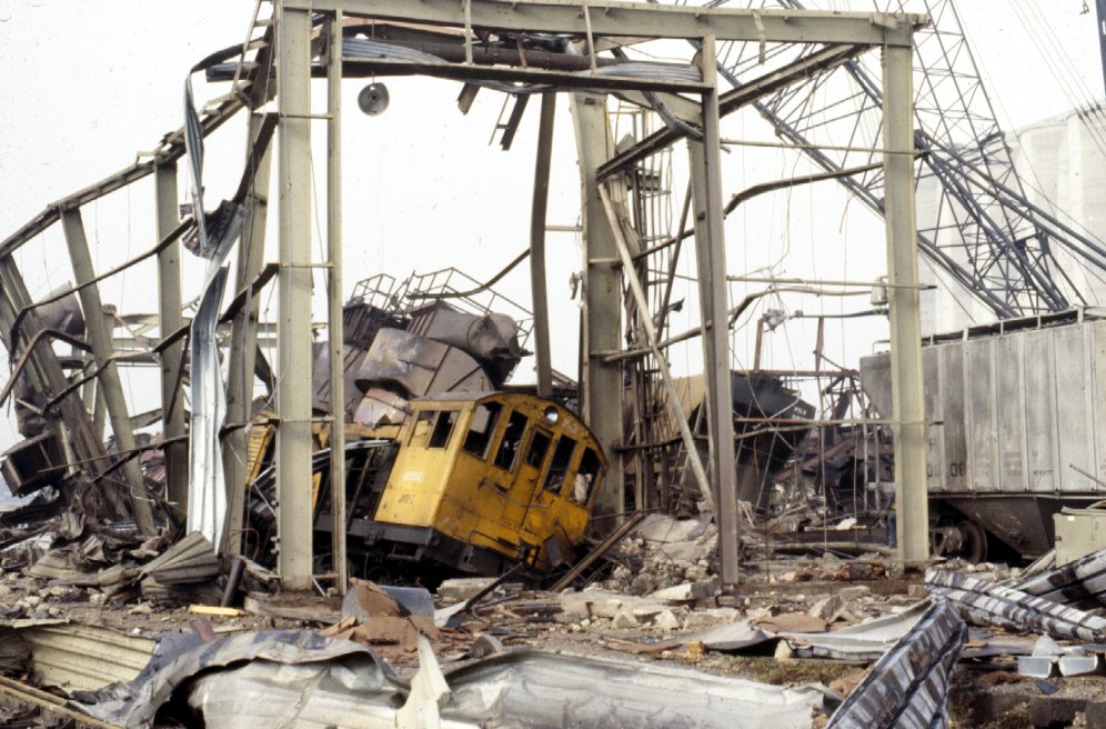 Rail shed destroyed by secondary explosion. Rail cars and switch engine also severely damaged. Operator of switch engine survived.
