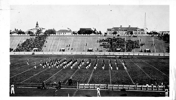K.S.C. Band marching across football field, October, 10, 1936