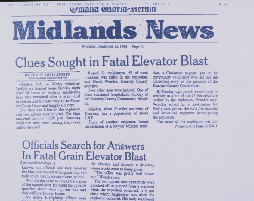 Two Omaha World-Herald newspaper storys, December 13, 1993; 'Clues Sought in Fatal Elevator Blast,' and 'Officials Search for Answers in Fatal Grain Elevator Blast.'