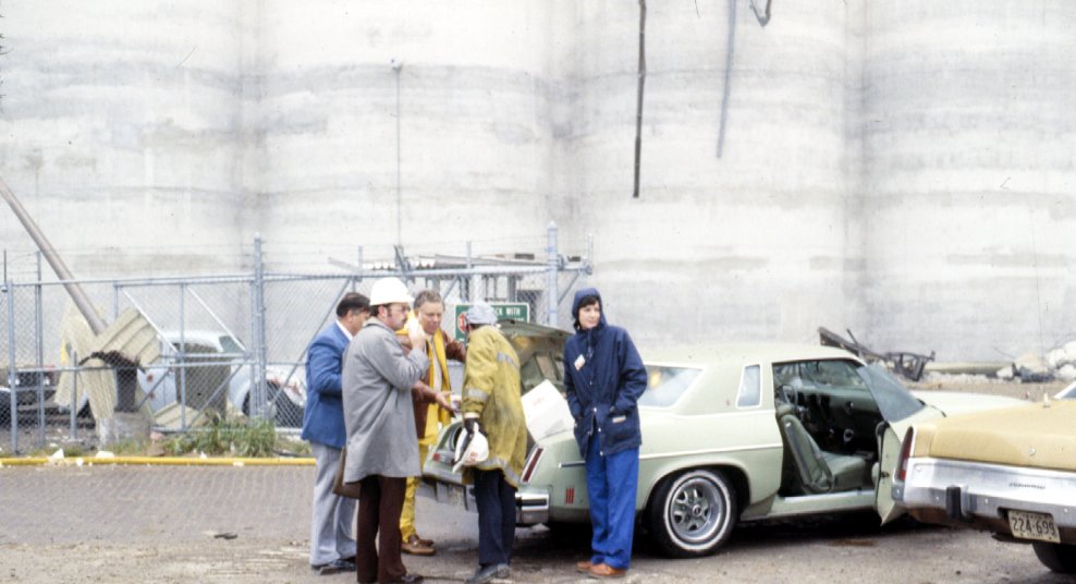 Red Cross personnel arriving to provide food and drink.
