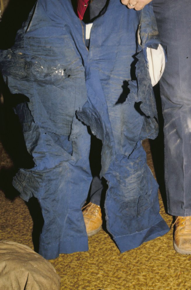 Burned coveralls; operator had long winder underwear on and thus saved him from more serious burns on his legs and body.