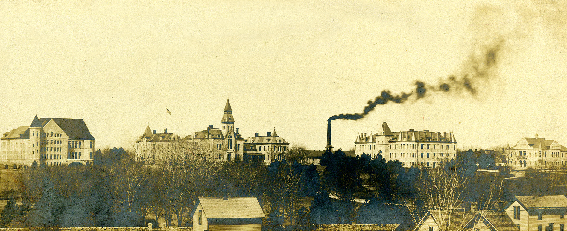 A view of campus from the east including Fairchild Hall, Anderson Hall, Women's Gymnasium (now Holtz Hall), Physical Sciences Building (later Denison Hall), and Agriculture Building (now Holton Hall).