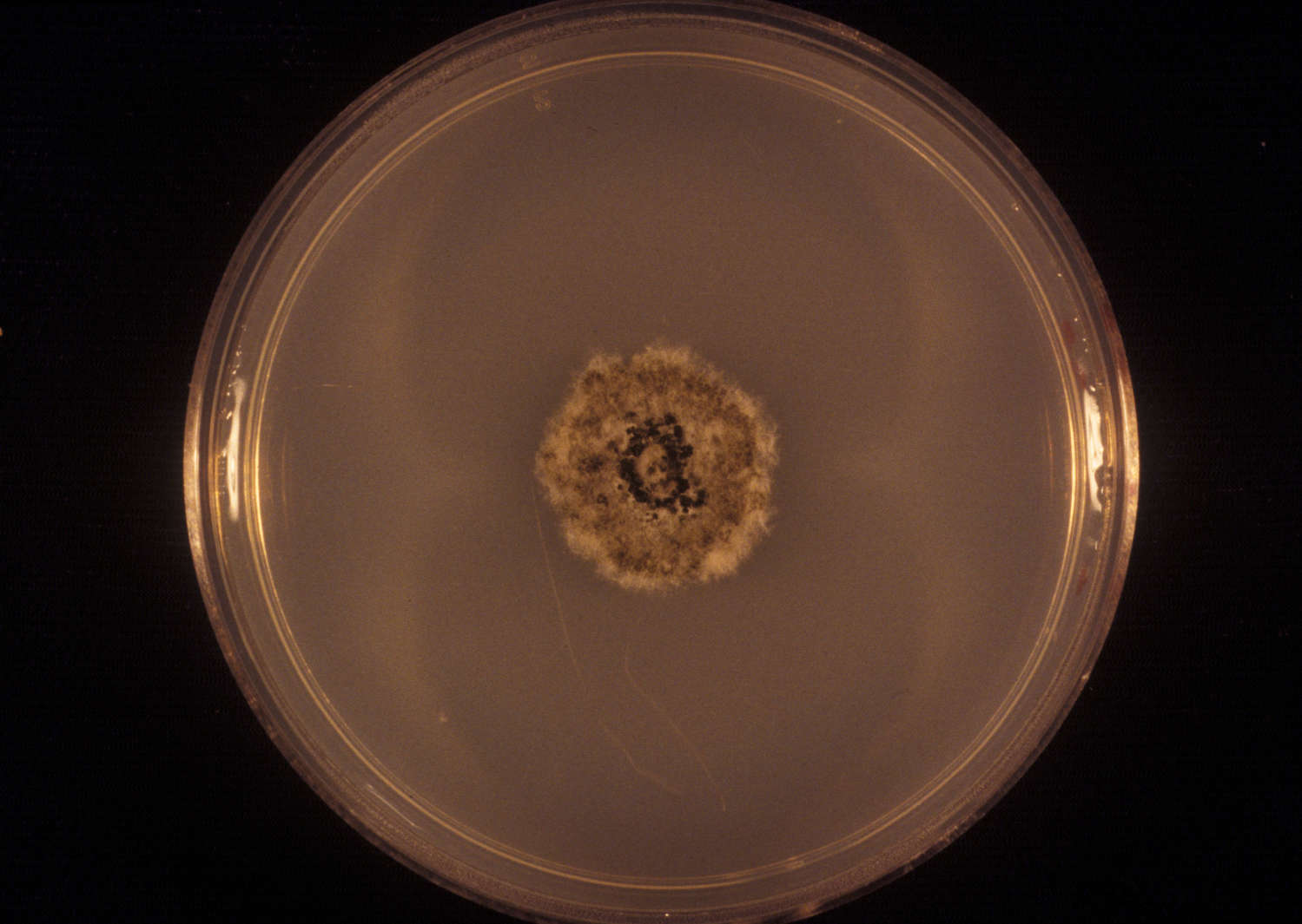 Colony of R. sorghi growing on tryptone starch agar. 10 days growth.