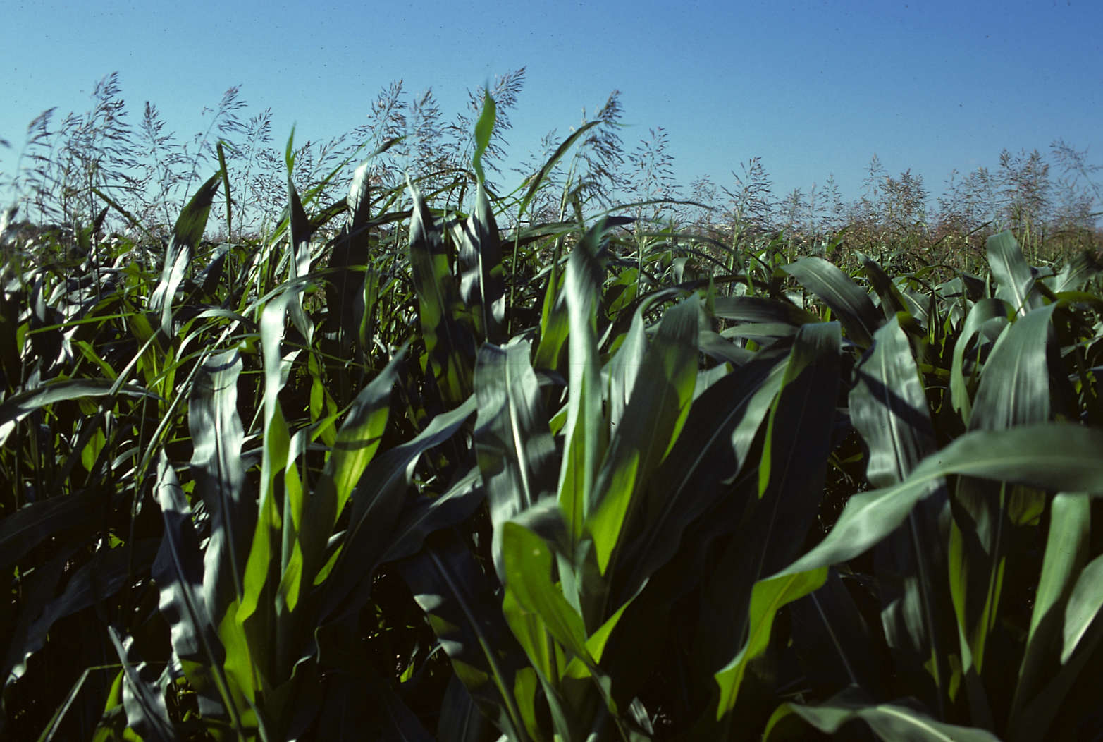 Photograph showing a heavy infestation of johnson grass in a corn field.