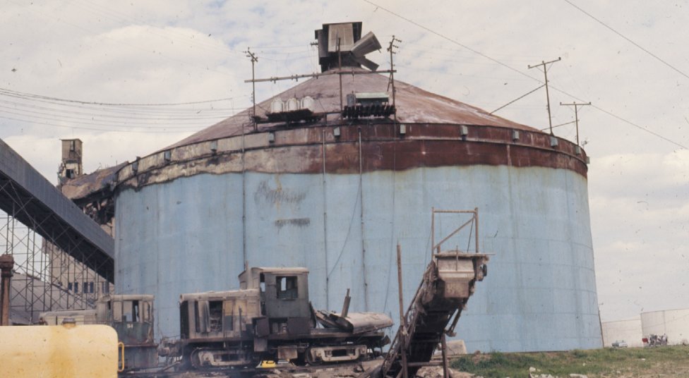 Fire damage to 500,000 bushel storage tank from burning grain.