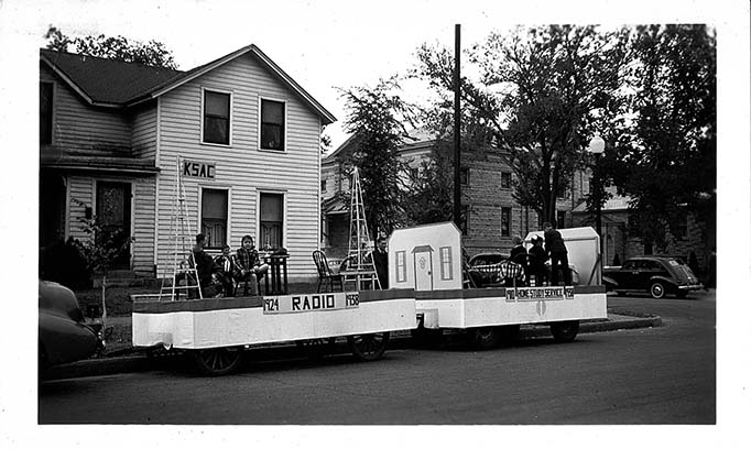 KSC Home Sturdy Service float and KSAC Radio float, 75th Anniversary Parade, Manhattan, KS, October 29, 1938