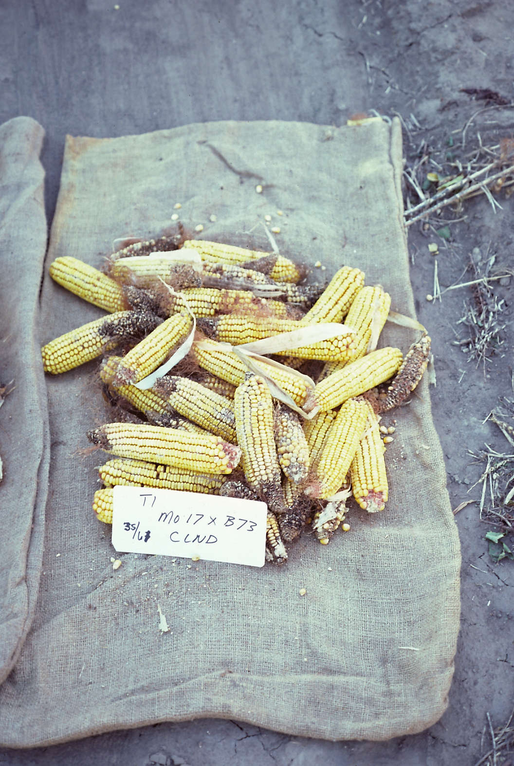 Hybrid MO17 X B73 was inoculated at the 3-leaf stage of growth with MCMV and MDMV. Ears represent yield of plot. First photograph in a series of six.