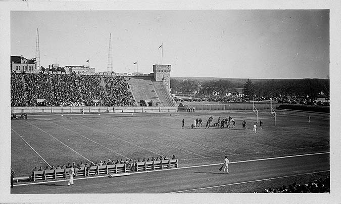 Kansas State College trying for a point after a touchdown in the Kansas State Agricultural College versus Iowa State College football game