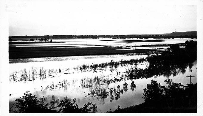 View of flood waters in the old Blue River channel with bluffs south of the Kansas River, June 5, 1935