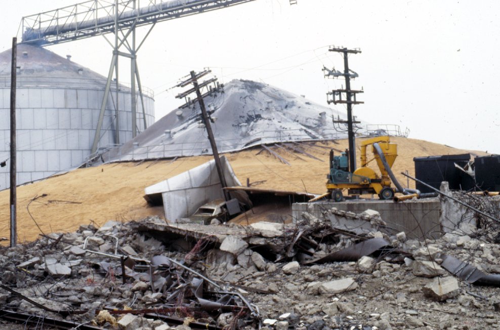Another view of collapsed 500,000 bushel steel storage bin.