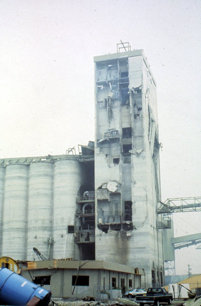 Blue dust collector in lower left corner was located above the transfer point in the underground conveying system from rail shed to the elevator. Damage to the office building located above the tunnel was mostly from debris from the headhouse. The manager's office was a shambles.