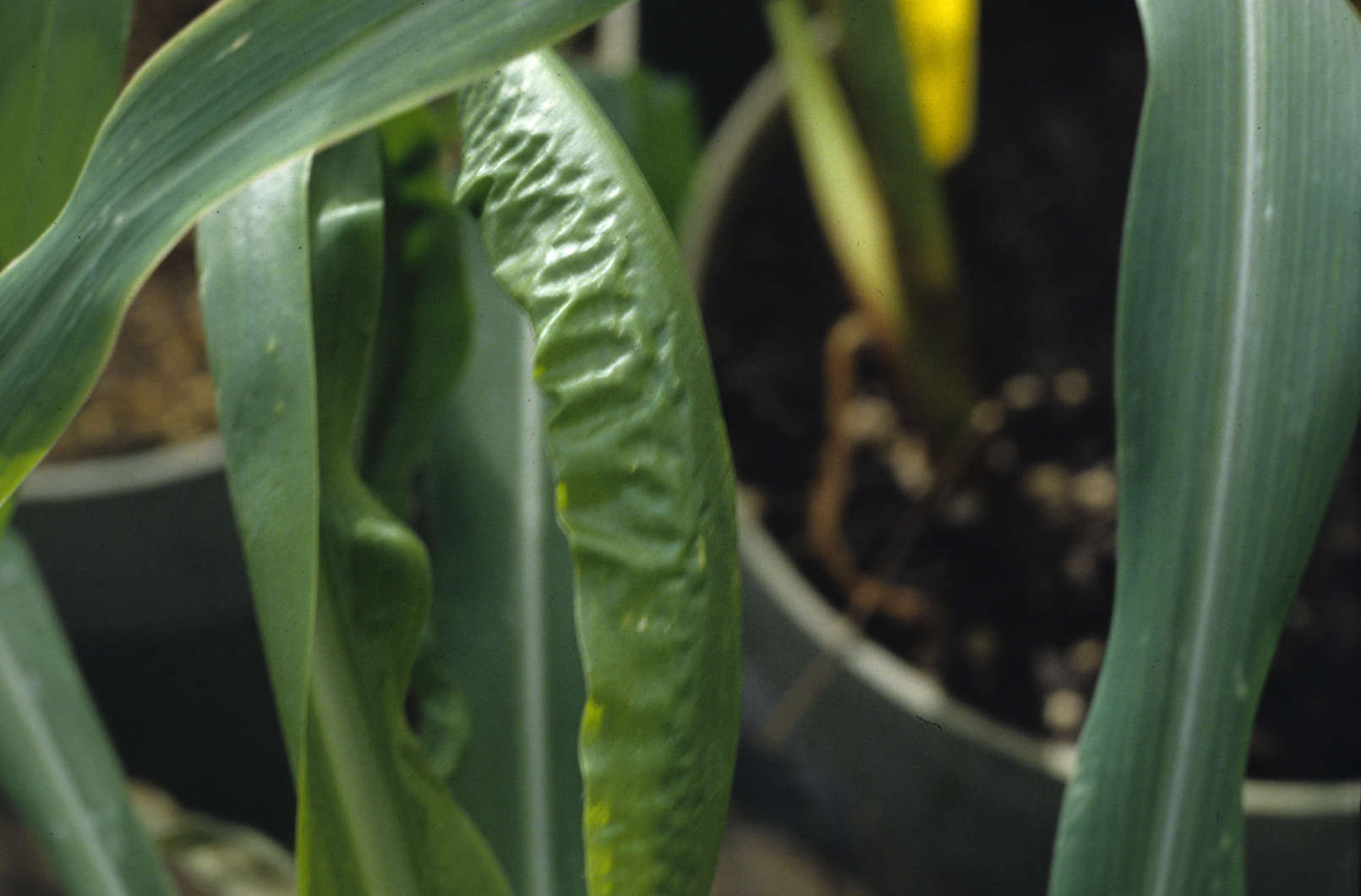 Leaves of pokkah boeng infected plants commonly have a thickened and wrinkled texture.
