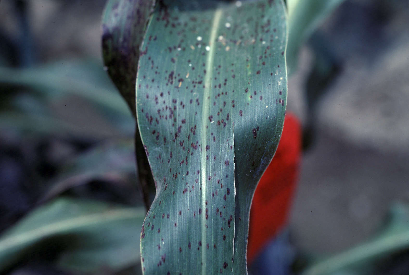 Poza Rica, Mexico: Small local lesions of sorghum downy mildew on a moderately resistant plant.