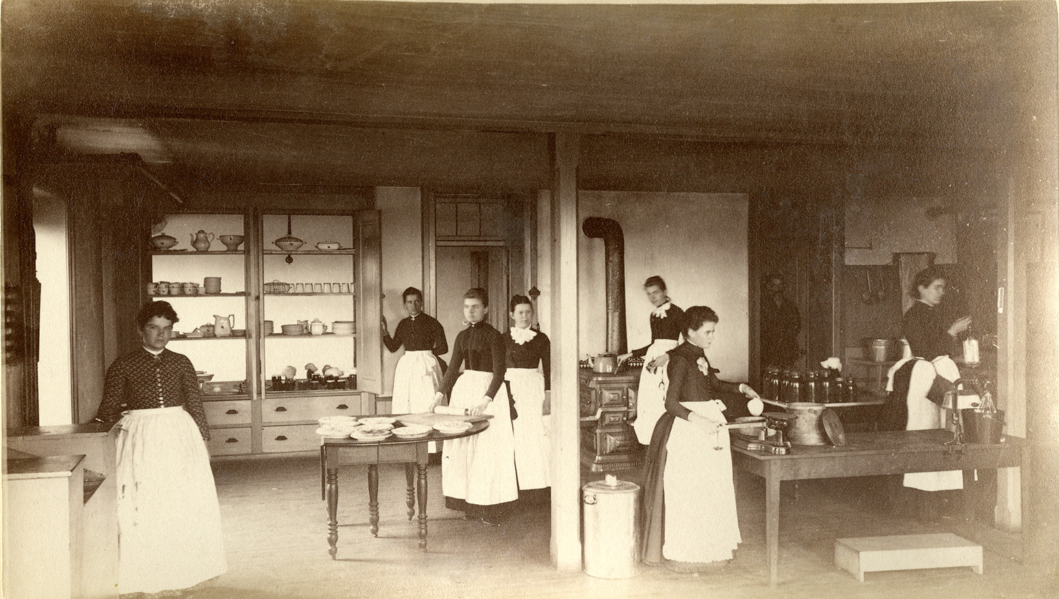 Citation: Courtesy "Kitchen laboratory in 1888", Photograph Album 12 Page 20: Kitchen Class, Morse Department of Special Collections, Kansas State University Libraries.
