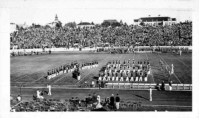 Kansas State Agricultural College band in KS formation performing between halves of the Kansas State Agricultural College versus University of Nebraskas footbal game