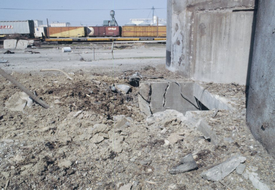 Close up view of blown out tunnel opening under silos.