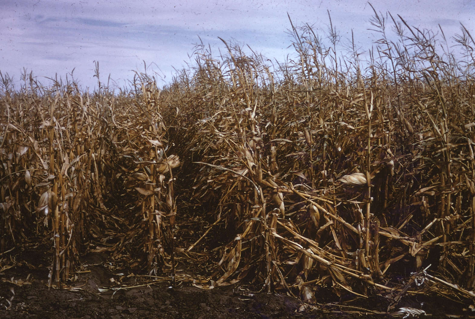 Hybrids show genetic variability to charcoal rot. Hybrid on left had only 1% of plants lodge whereas adjacent hybrid had 35%. Charcoal rot is favored by dry and hot conditions.