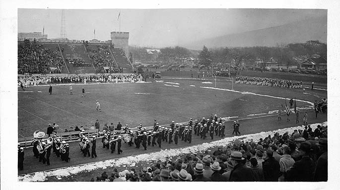 Bands on track at the Kansas State College versus Fort Hays Kansas State College footbal game