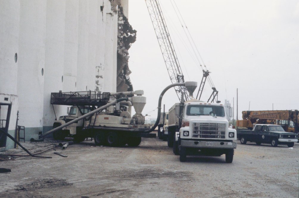 Starting salvage of stored grain using pneumatic vacuators.