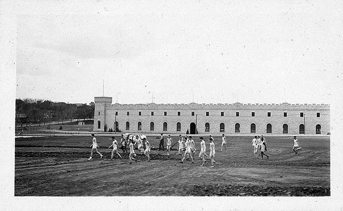 Physical education male students are returning from ball practice