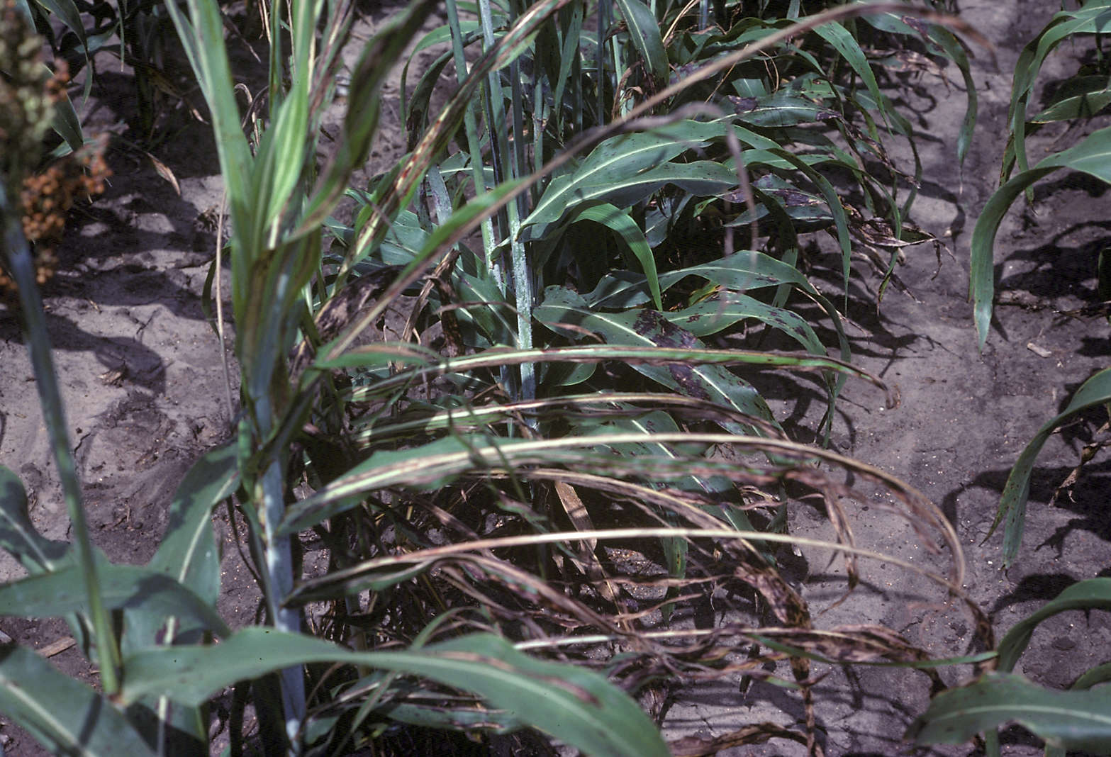 Extensive shredding of leaves of a susceptible sorghum genotype in a nursery.