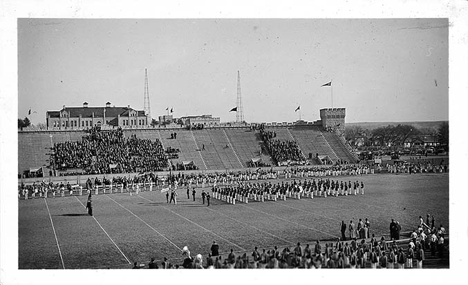 High school band performing at Kansas State Agricultural College Memorial Stadium