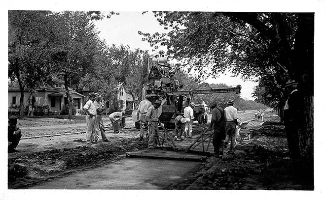 Construction workers using small cement paver on Poyntz Ave, Manhattan, KS, May 1934