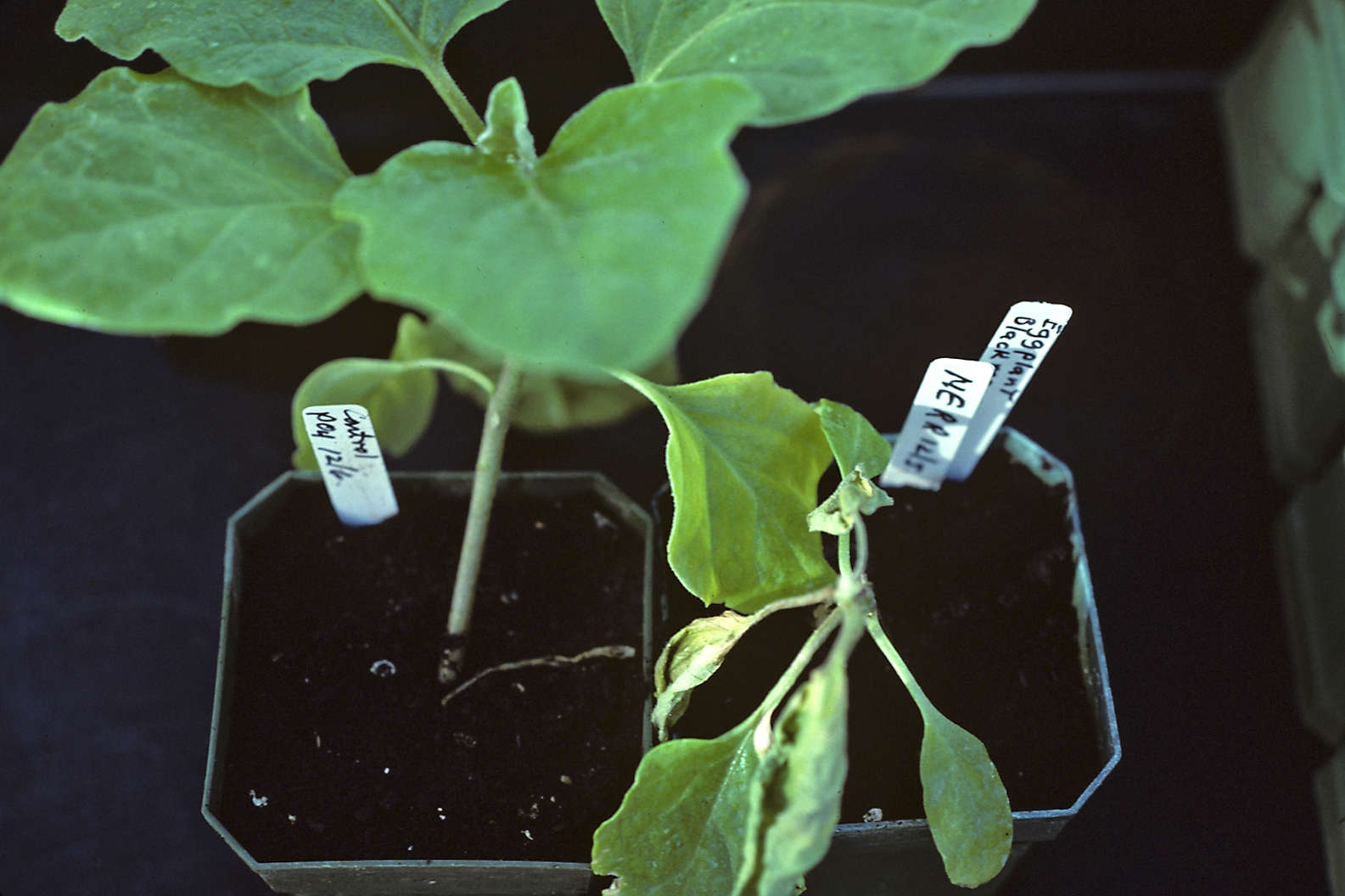 Plant on right was inoculated with c. michiganensis subsp. sepedonicus. Plants were inoculated 16 days previously.