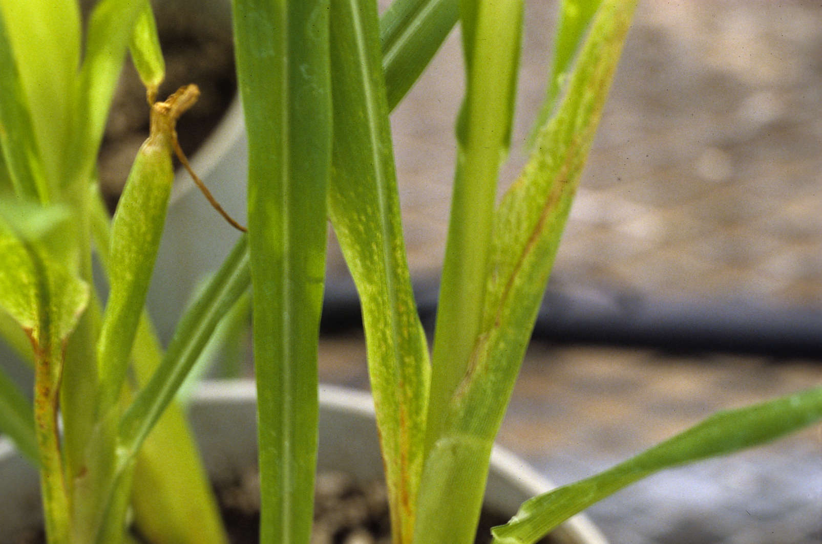 White spots and twisted top symptoms of a corn plant inoculated with F. proliferatum in the greenhouse.