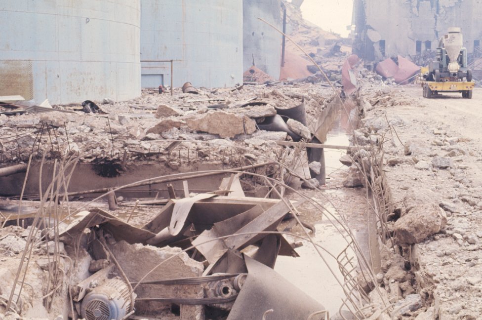 Receiving tunnel from rail shed left of steel tanks blown out completely.