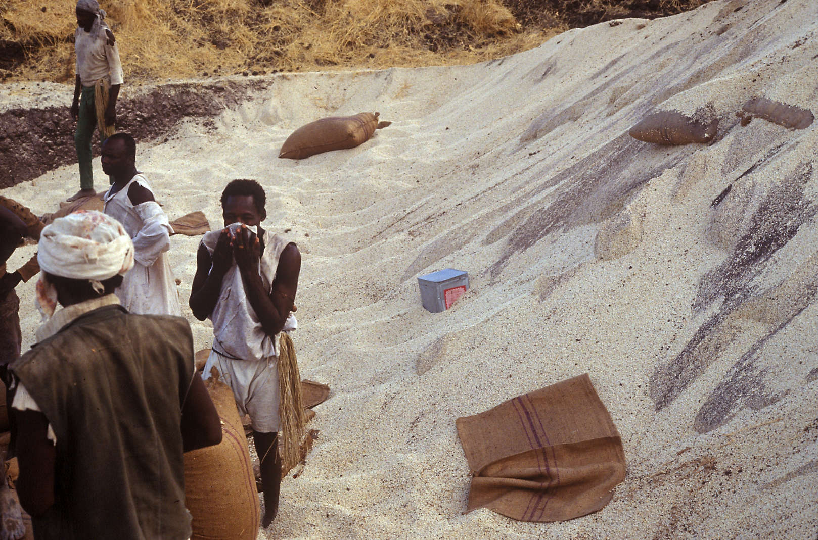 Wad Medani, Sudan: Workers have cleaned soil from the sorghum and are now filling burlap bags with the grain.