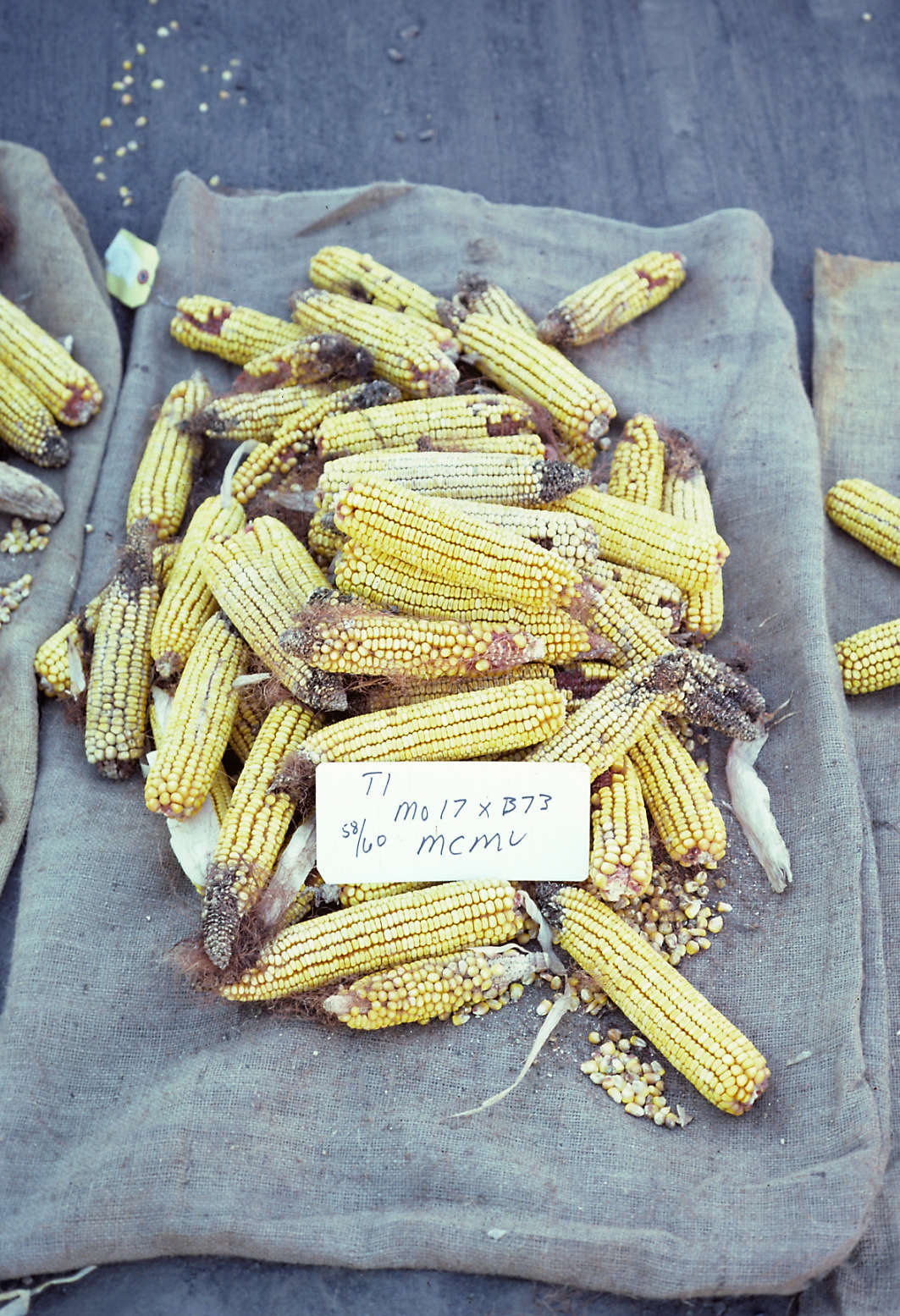 Hybrid MO17 X B73 was inoculated at the 3-leaf stage of growth with MCMV only. Ears represent yield of plot. Final photograph in the series of six.