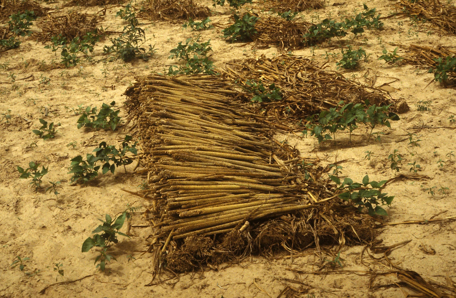 Plants have been harvested and stored in the field for drying. Seed will be saved for human consumption and stalks fed to animals. Note peanuts were planted and intercropped with the millet.
