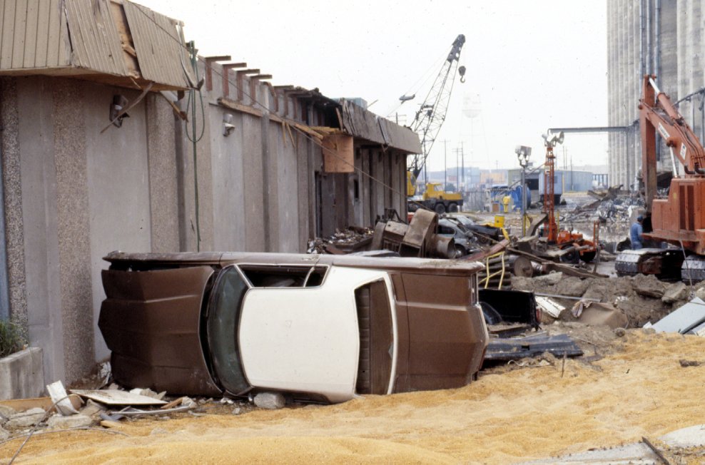 Damaged vehicle and back side of office building.